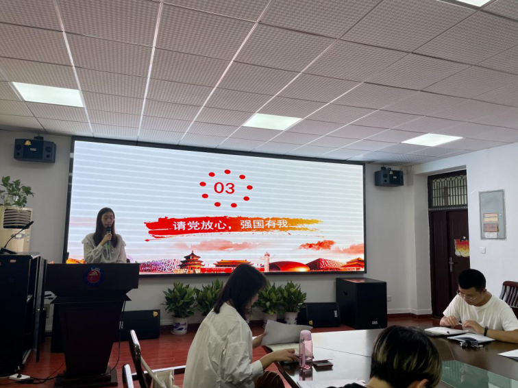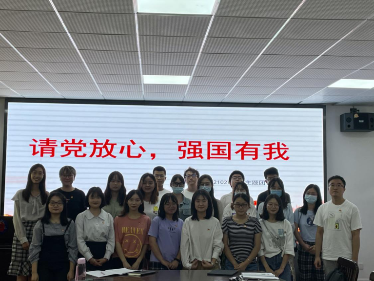 在此之后,由马院2021级第二团支部团支书周怡男主持了“请党放心,强国有我”主题团日活动。周怡男从习近平总书记“七一讲话”内容出发,带领同学们简要回顾中国共产党成立100年来,团结带领全国各族人民不懈奋斗的光辉历程和伟大历史贡献,系统阐述了“以史为鉴,开创未来”九个必须的深刻含义。其次,她以“不负时代,不负韶华”为核心内容,呼吁团支部成员把青春奋斗融入党和人民的事业中。接着,周怡男为大家播放了庆祝中国共产党成立100周年大会视频节选,1068名共青团员和少先队员代表组成的献词方阵发出“请党放心,强国有我”的铮铮誓言,热血澎湃,将团课的气氛推向高潮。