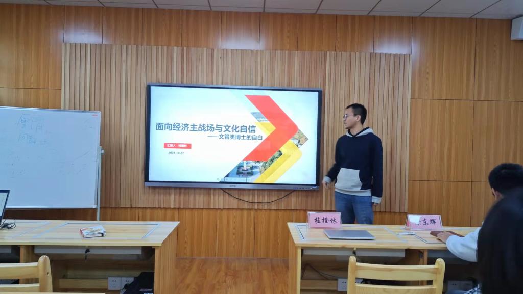 2021年10月27日,马克思主义学院博士党支部于东七楼207会议室召开“弘扬伟大建党精神 争做卓越华中大人”主题十月组织生活会。我校2020-2021年度“三好研究生标兵”荣誉称号获得者、管理学院2018级博士生桂橙林,红色理论学讲团主席、马克思主义学院2021级博士生徐东辉参会。会议由马克思主义学院博士生党支部书记李想主持。