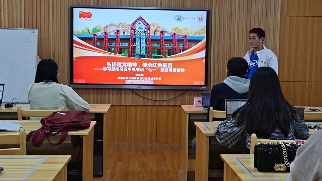 会议第一项,由徐东辉讲授《弘扬建党精神,传承红色基因——学习贯彻习近平总书记“七一”重要讲话精神》主题微党课。他以习近平总书记在庆祝中国共产党成立一百周年大会上的重要讲话为切入点,从坚持真理、坚守理想,践行初心、担当使命,不怕牺牲、英勇斗争,对党忠诚、不负人民四个方面分别结合相应的感人历史故事向大家讲述了伟大建党精神的主要内涵。随后,他以历史时期为划分,阐述了长征精神、焦裕禄精神和抗疫精神等在我国革命、建设、新时代等不同历史时期中国共产党人所铸就的伟大精神。徐东辉指出,新时代中国青年应传承红色精神,为中华民族伟大复兴做出贡献,正如习近平总书记在“七一”重要讲话中所强调:“新时代的中国青年要以实现中华民族伟大复兴为己任,增强做中国人的志气、骨气、底气,不负时代,不负韶华,不负党和人民的殷切期望”。