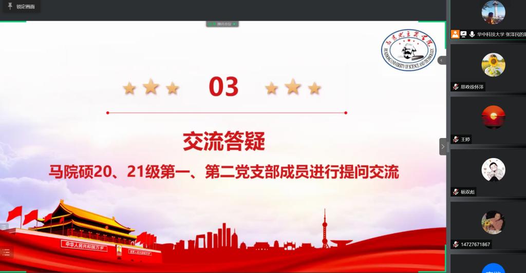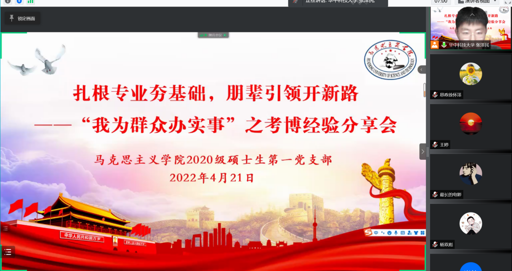 为激发马院研究生潜心学术、读博深造的热情,进一步提升20、21级硕士研究生的学术素养与研究能力,培育浓厚的学术氛围,满足同学们对于考博方面经验和知识的需求。4月21日晚,马克思主义学院2020级硕士生第一党支部组织开展“我为群众办实事”系列活动第二期——考博经验分享会,邀请往届深造读博的优秀毕业生分享其考博读博的经验与感受,为同学们提供考博、读博的经验准备,更好地发挥朋辈博士研究生的引领、带动、示范、辐射作用。