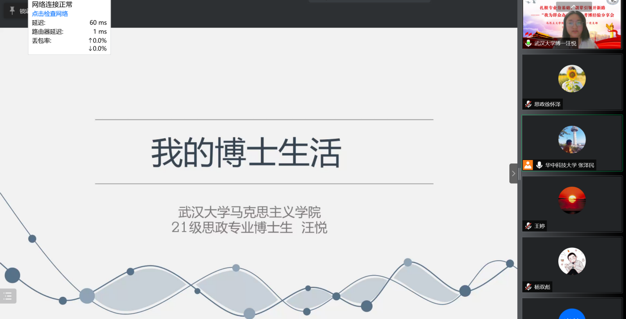 武汉大学马克思主义学院思想政治教育方向2021级博士汪悦以“我的博士生活”为主题,从申博的过程、博士学习生活、毕业与未来三个方面展开了本次的分享。其中,着重向同学们讲述了申博的过程中,首先要在官网查询相关考博时间、材料要求、导师信息。其次要主动联系学长学姐,了解备考上岸的经验以及导师招生情况。接着是通过自荐和他荐积极主动地联系报考导师。最后分享了笔试和面试两个方面的自身备考经验。
