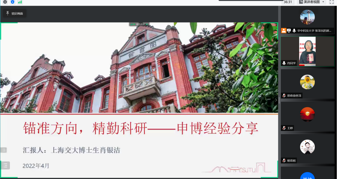上海交通大学马克思主义学院思想政治教育方向2020级博士肖银洁以“锚定方向,精勤科研”为题展开了申博经验分享,她从前期准备、报考要领、初试材料、复试重点四个方面为切入点进行分享,其中,在前期准备环节,要提早决定,做好充足准备;在报考上,要立足实际,多报考几所心仪学校,多渠道了解报考的导师;在读博体会上,师姐嘱咐大家要认清能力和兴趣,平衡好学习与健康。