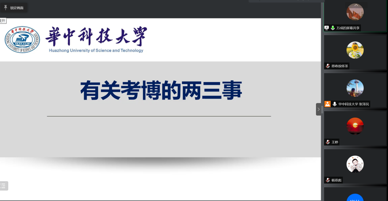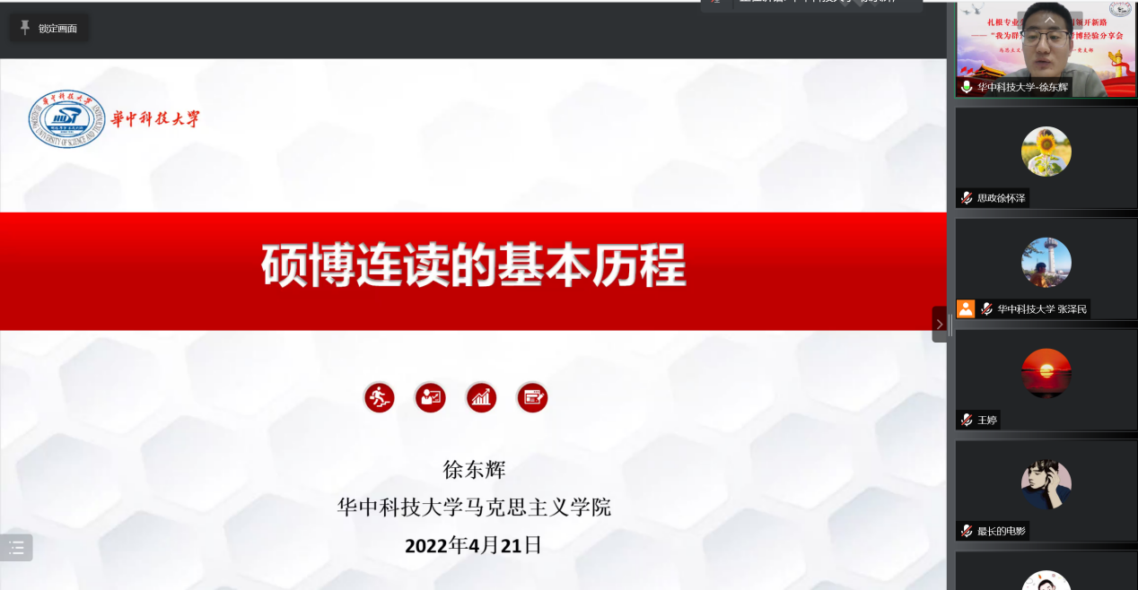 在经验分享环节,华中科技大学马克思主义学院马克思主义中国化方向2021级博士研究生徐东辉以“硕博连读的基本历程”为题,从为什么要选择硕博连读这个问题出发,向同学们分析了硕博连读的优劣,紧密结合自身的经历,分析了硕博连读的基本条件、时间节点、基本经验、其他路径等相关问题。