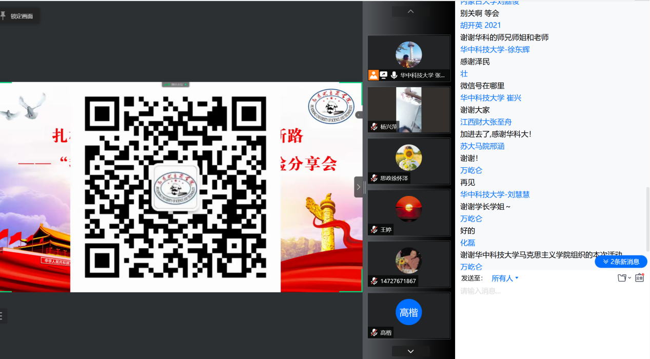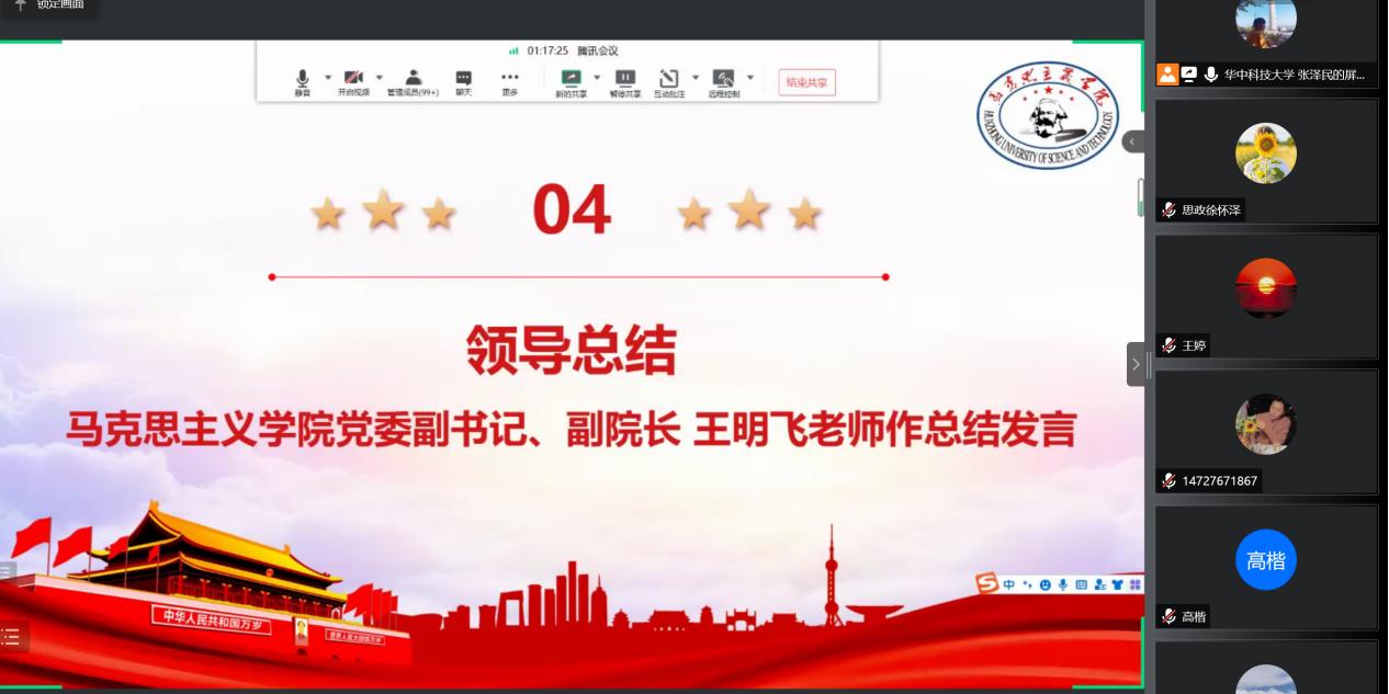 分享会最后,马克思主义学院党委副书记、副院长王明飞老师进行了总结发言。王老师首先对参与本次分享会的四位校友嘉宾表达了感谢,透过四位校友的精彩分享展现出了马院学子之间友爱、互助、团结的优良传统和深厚情谊,充分发挥了朋辈帮扶作用,博学之路虽漫漫,但有众人相伴前行。与此同时,王老师也希望本次分享会能对同学们有所启发,并鼓励大家努力学习,在未来的学习、科研道路上怀抱初心,步履不停,以梦为马,不负韶华,加足“马”力,携手拼“博”。
