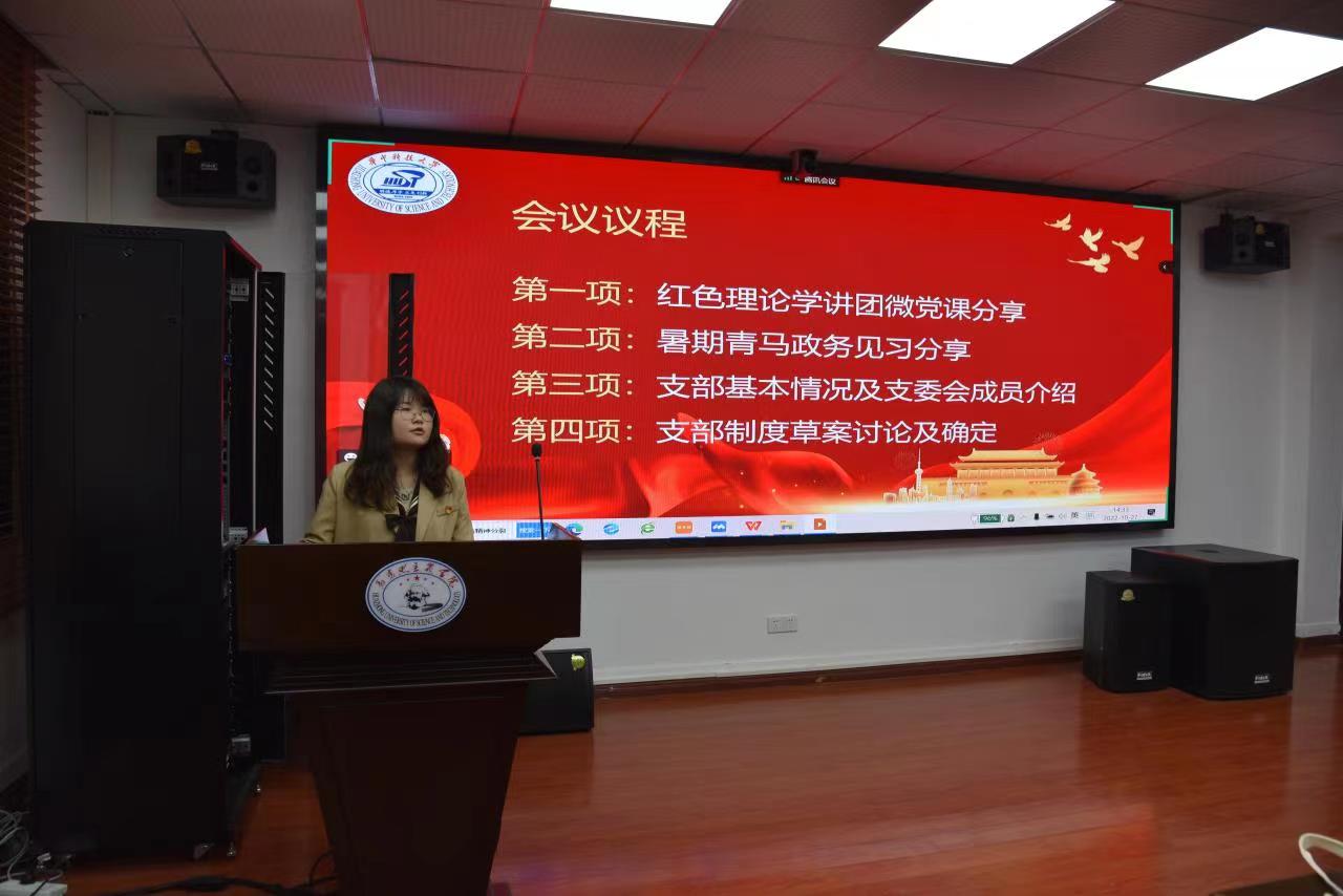 随后,党支部成员张会杰同志联合思政专业孙昕月同志、马原专业余鹏涛同志为大家分享暑期青马政务见习的心得感受。他们以“青马学校百人政务见习团——与英雄城市一起向未来”为主题,从政务见习、理论学习、调研实践和志愿服务四个部分展示和介绍了他们在社会课堂中“受教育、长才干、作贡献”的过程。张会杰同志表示自己在暑期青马政务见习中真正体会到了“实干出真知”的道理,只有将理论与实践相结合,在奉献自我中提升自我,才能更好地贡献青春力量,展现青马风采;只有不断增强政治意识,锤炼工作本领,才能在实干中淬炼意志、磨炼品格,彰显青马精神。
