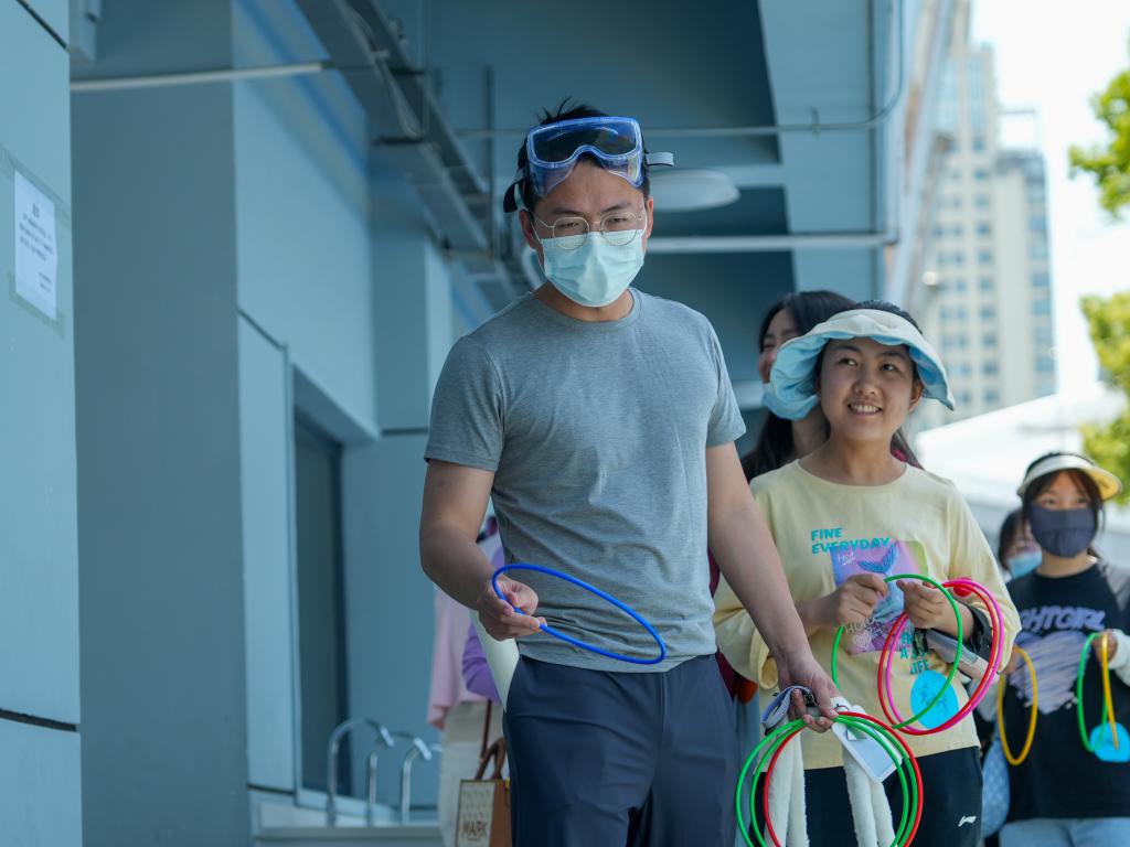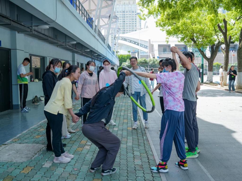 环环相扣,一圈到底。一圈到底比赛开始,队员们迅速利用手臂的力量将呼啦圈甩起,旁边的队友微微屈膝,呼啦圈就从头顶直落到腰际。衔接处的每一次传递,一环扣一环的流畅过程,不仅需要个人的肢体柔韧度,也考验着队友间的协调配合能力。