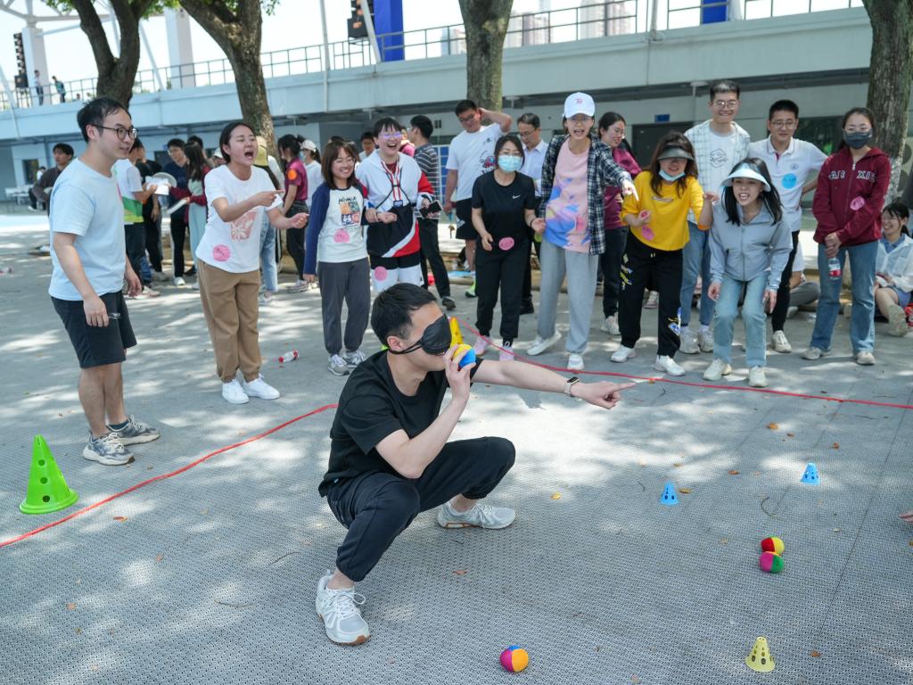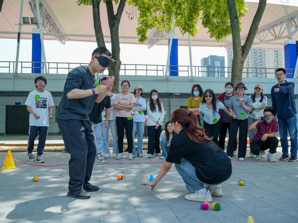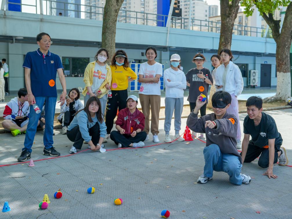沙场之上,两军对垒。“指挥官”在场外指挥蒙眼的“士兵”在躲避“地雷”的同时准确找到沙包,击中对手。这不仅考验了“士兵们”的反应能力和躲闪能力,也充分展现了“指挥官们”冷静沉着的头脑和团队配合的默契。