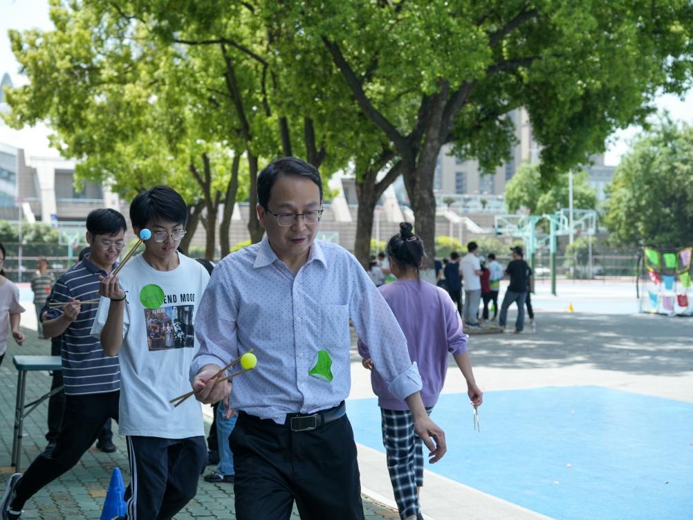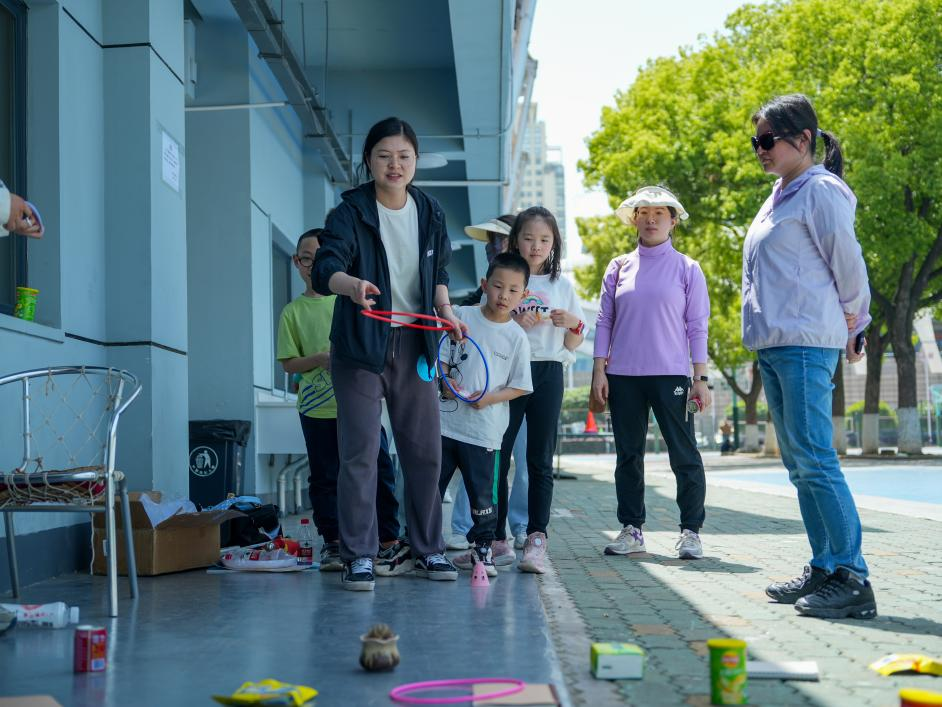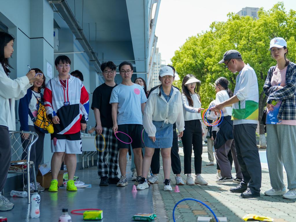 趣味游戏进入尾声,师生们来到套圈场地,瞄准目标,手起圈落,套到心仪的奖品。