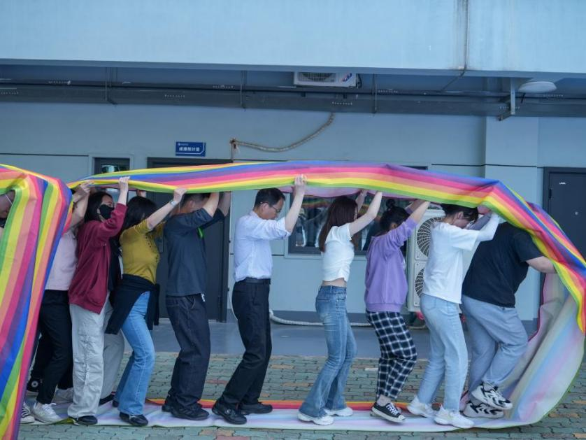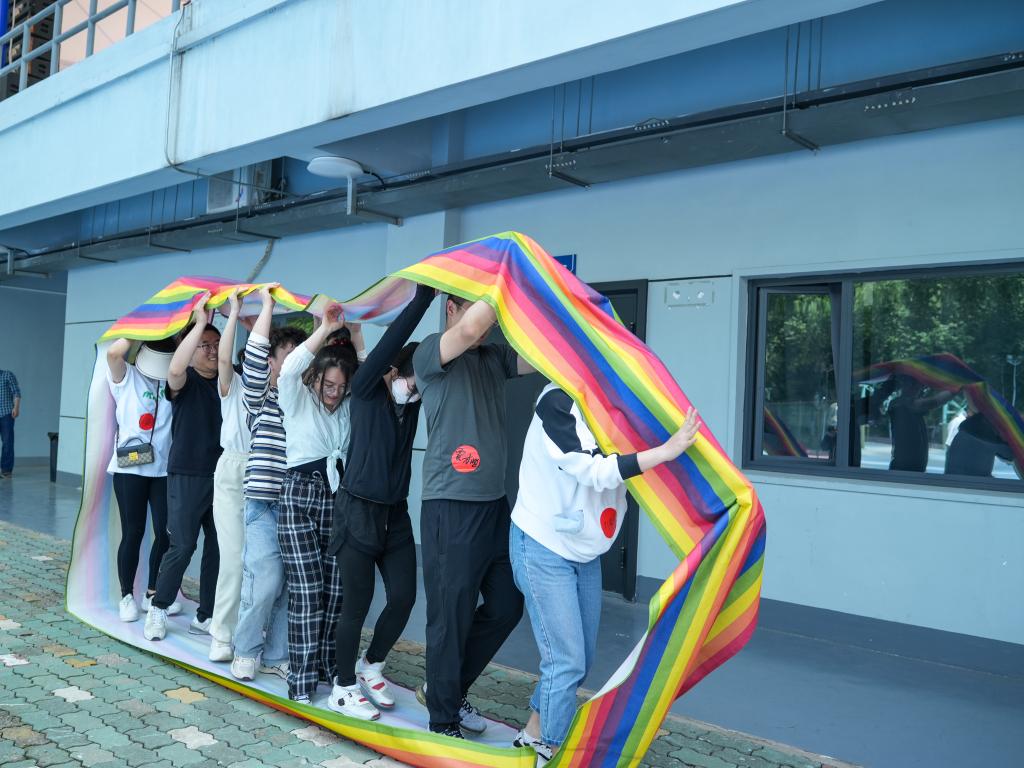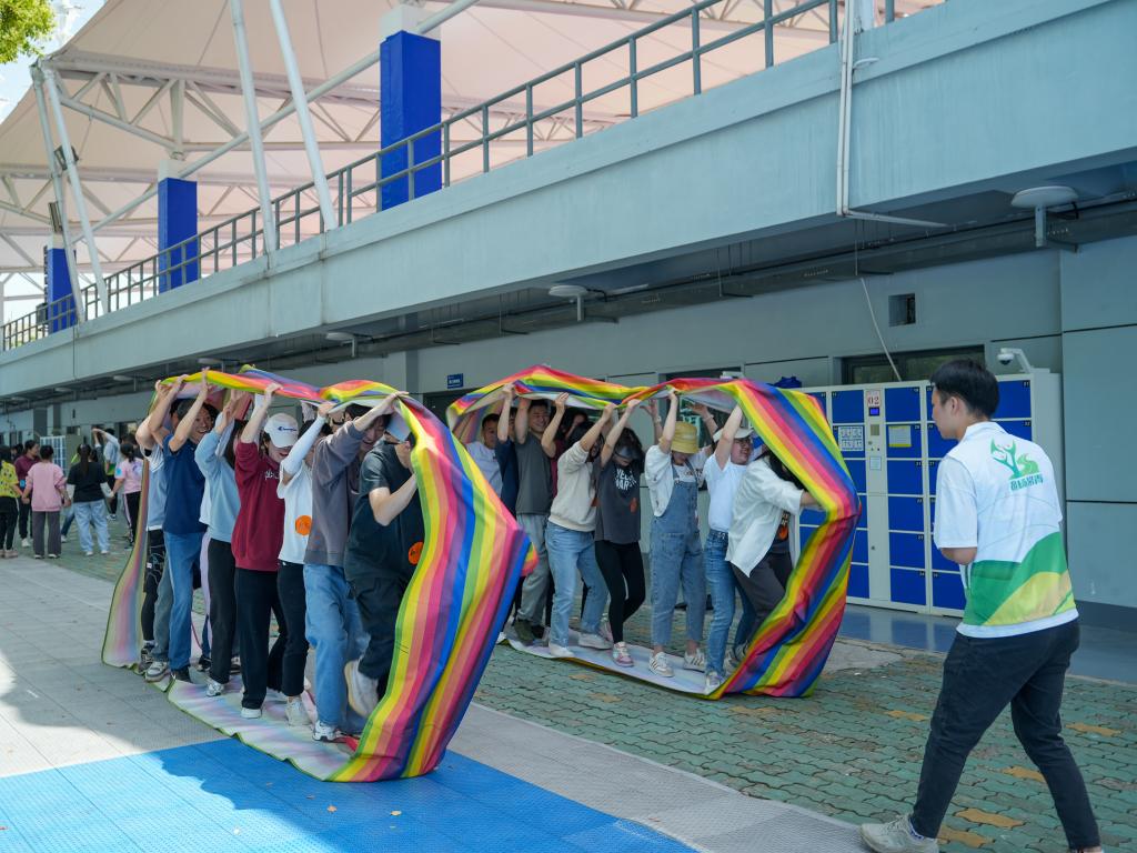 同舟共济,密切合作。队员们站进彩色的履带中,步调一致向前行进,在洪亮整齐的口号声中,履带成功将小队所有成员运送至终点。老师同学们相互配合,团结一致,为了共同的终点线而前进。