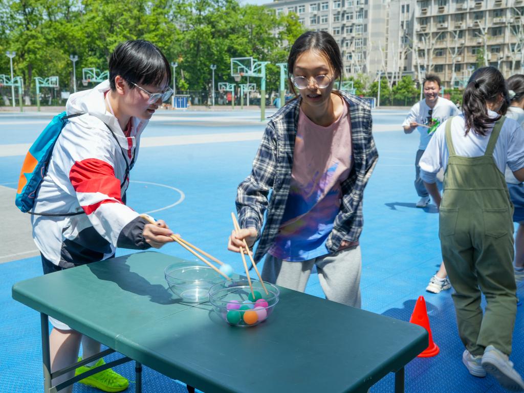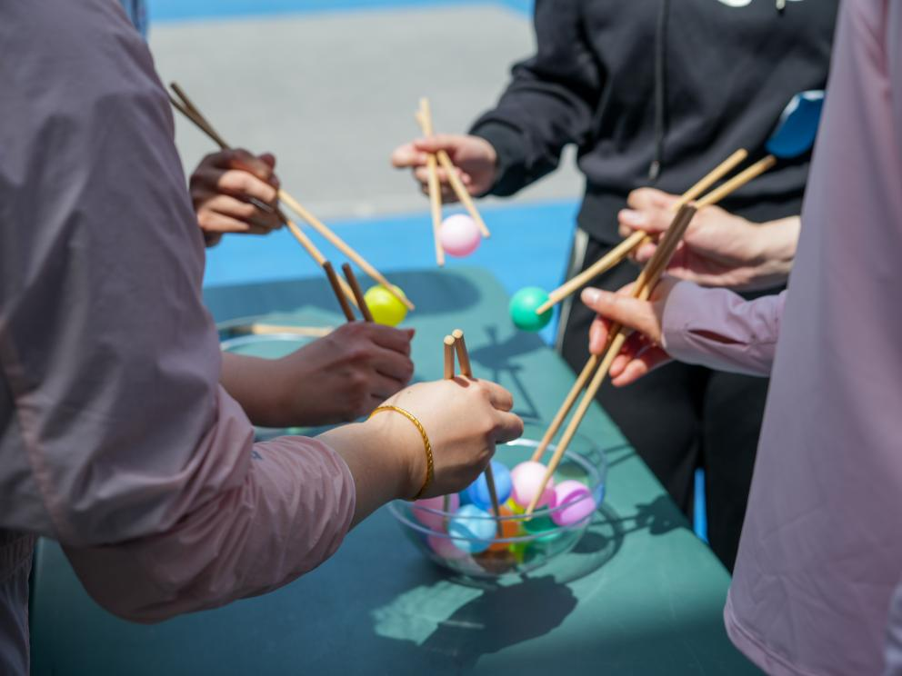 跨越阻碍,争分夺秒。在限定的时间内,队员们用筷子夹紧乒乓球,灵活地绕过障碍物,又稳又快,将乒乓球安全运送到对面的碗中。