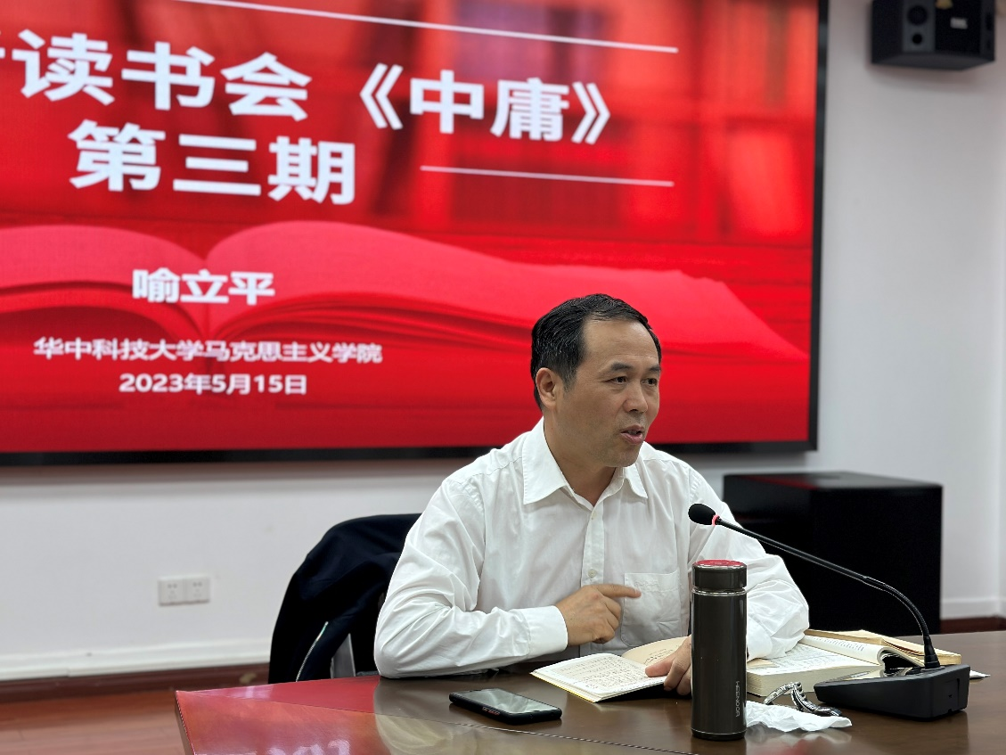 5月22日晚7点,马语者精读传统文化系列《中庸》第三讲于东七楼203会议室举办。我院特聘教授喻立平承接第二讲,对《中庸》一书展开深入讲解。本次讲座特别邀请中国好人、荆楚雷锋严昌筠到场参加,近60名研究生参与本次讲座。