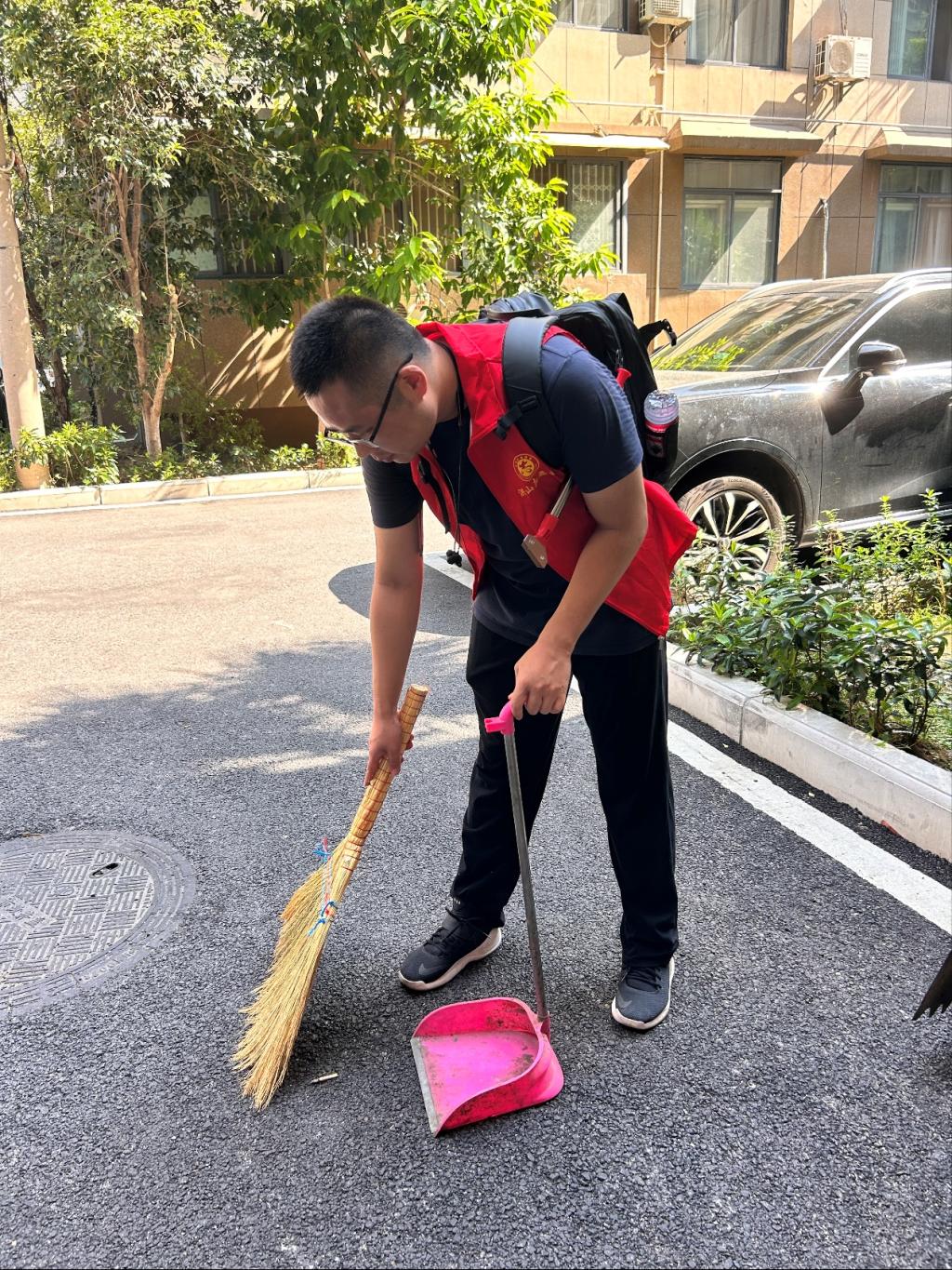 上午九时,志愿者在活动负责人的带队下准时到达碧水社区。在与社区沟通后,志愿者们被分为两组。每组志愿者都分发有扫帚、簸箕、垃圾袋、夹子和铲子等劳动工具,随后由社区工作人员带往两个片区进行清扫活动。