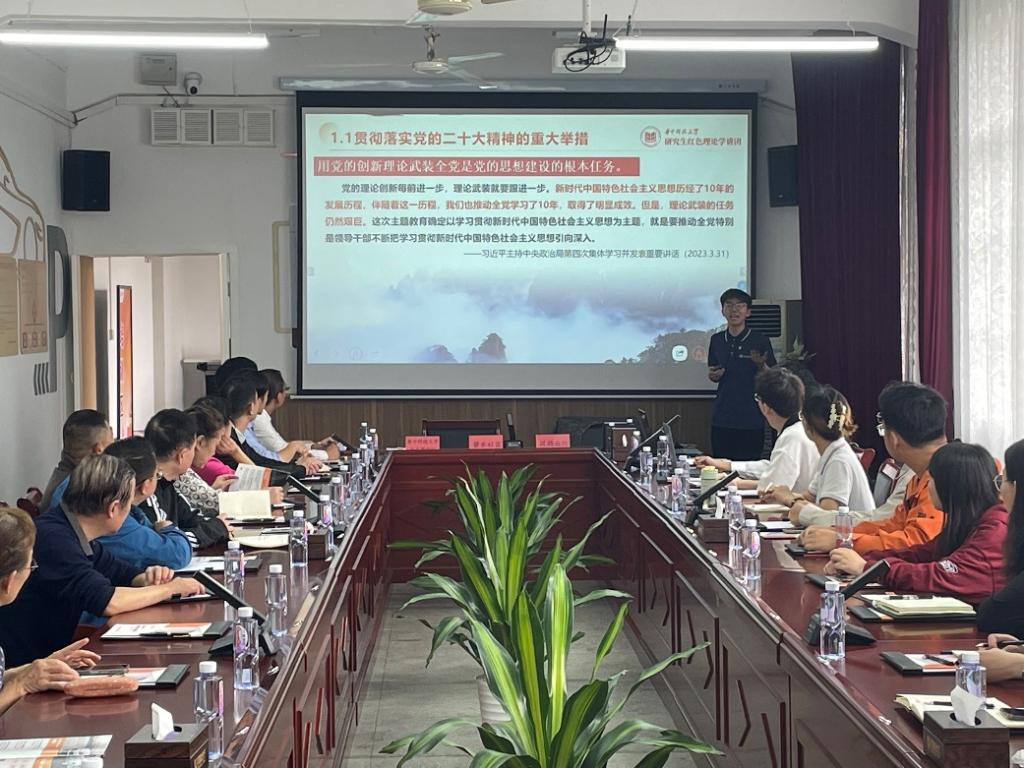 首先,我院硕士研究生、校研究生红色理论学讲团学生讲师郑亚洲以《以学铸魂、以学增智、以学正风、以学促干——学习贯彻习近平新时代中国特色社会主义思想主题教育工作会议精神》为主题讲授了专题党课,他以“何以有、有什么、如何看”为主线,阐释了开展新思想主题教育的重要意义、学习内容和预期效果。