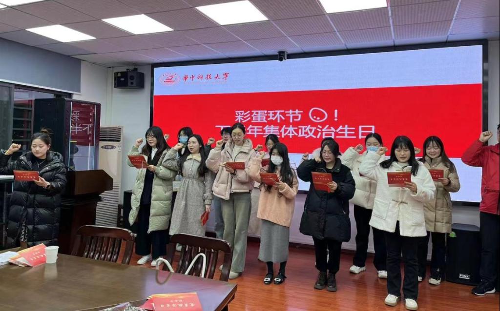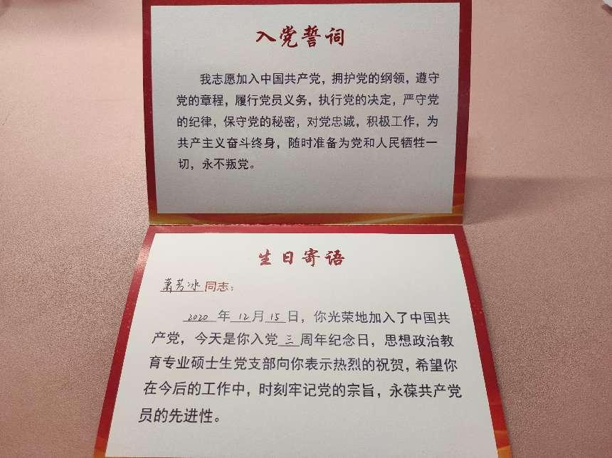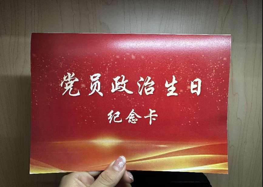 理论学习结束后,为强化党员的身份意识,凝聚组织的向心力,支部特设置“集体政治生日”环节,并设计制作政治生日纪念卡,寄语各位党员不忘初心、牢记使命,接续奋斗、砥砺前行。随后,刘孟迪带领党员同志重温入党誓词,希望大家始终牢记党员身份,时刻发挥党员的先锋模范作用。