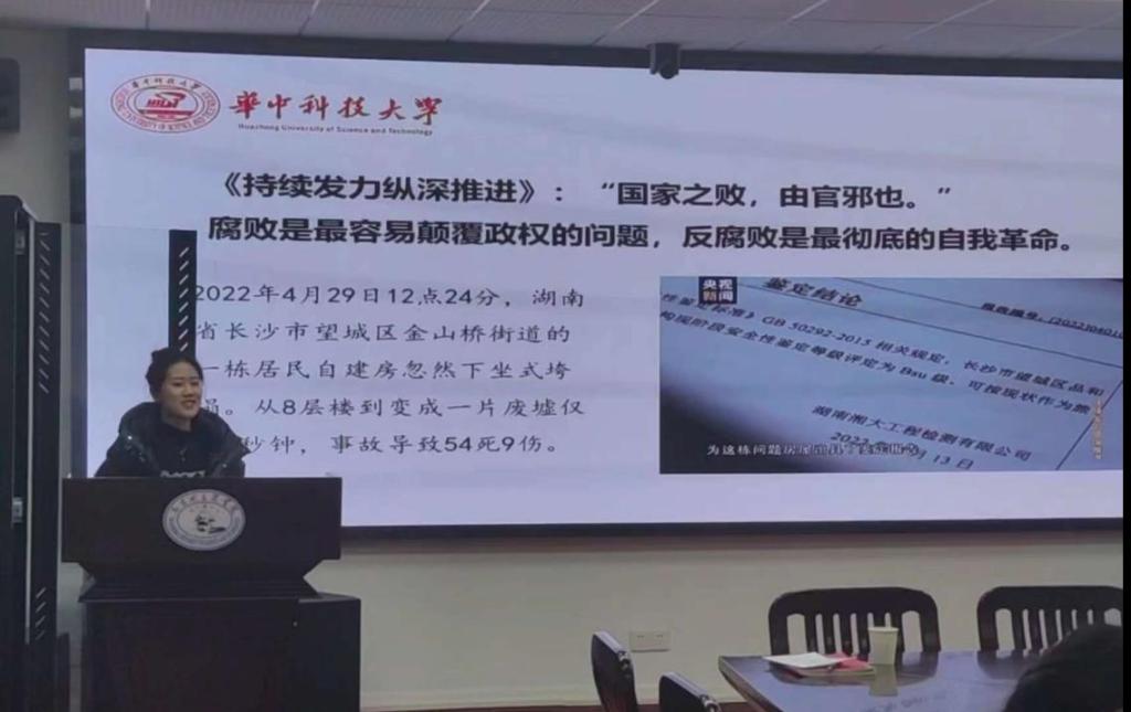随后,学校研究生红色理论学讲团成员杨一博以《为中国式现代化注入法治力量》为题进行微党课讲授。他以“灋”字的解读作为切入点,从“一脉相承,与时俱进”“依法治国,以法促治”“定法定纪,至法至得”三个方面详细讲解了习近平法治思想相关内容。他指出,党员同志们要紧密地团结在以习近平同志为核心的党中央周围,深入学习贯彻习近平法治思想,成为懂法、知法、守法的社会主义接班人。