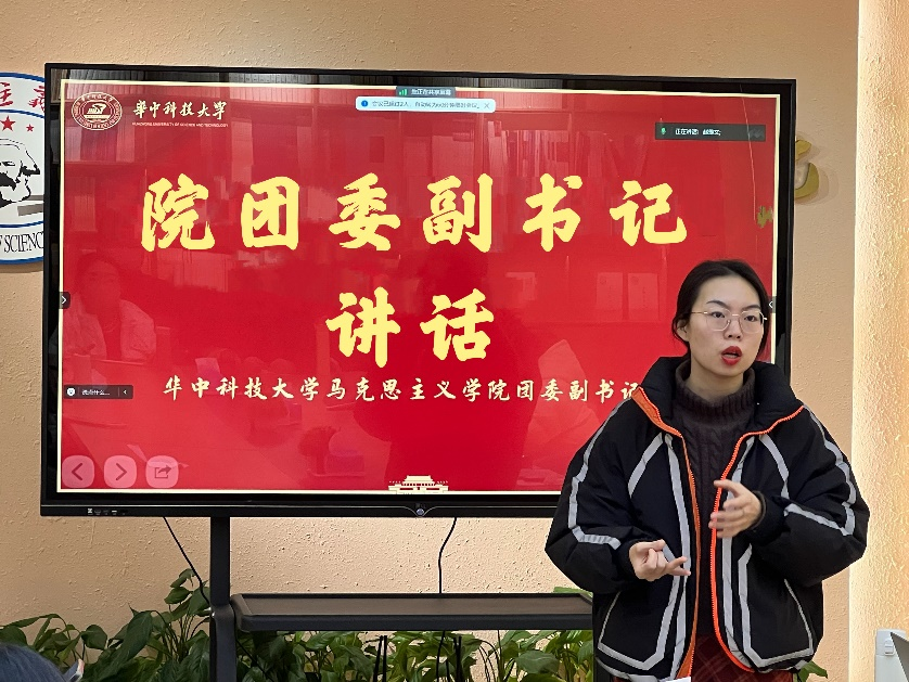 会议伊始,华中科技大学马克思主义学院团委副书记郭乙发表讲话。她提出,支部成员应团结协作,友爱互助,相互学习,共同进步。希望大家在即将到来的寒假期间注意安全,报告好假期去向,并预祝大家新年快乐。