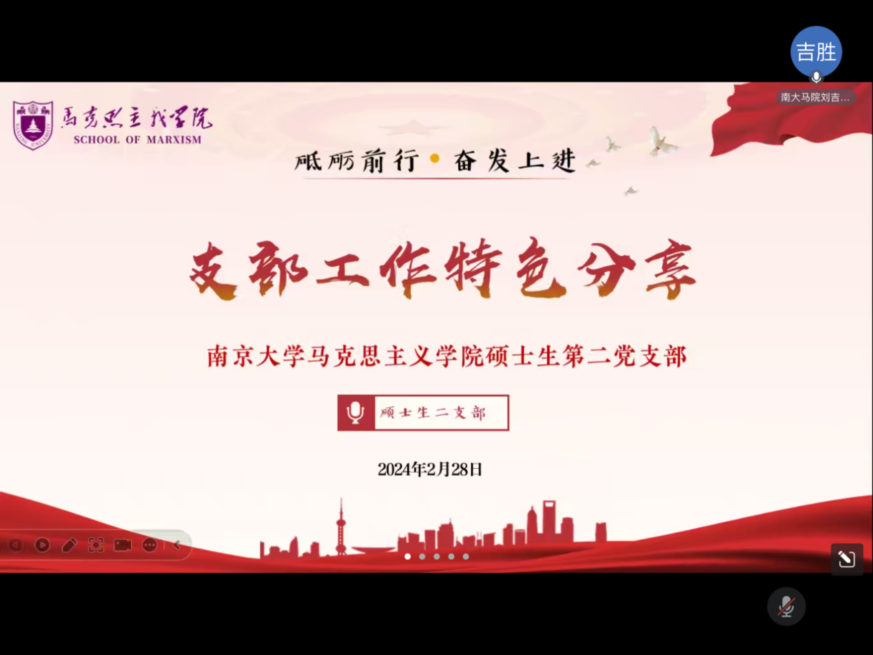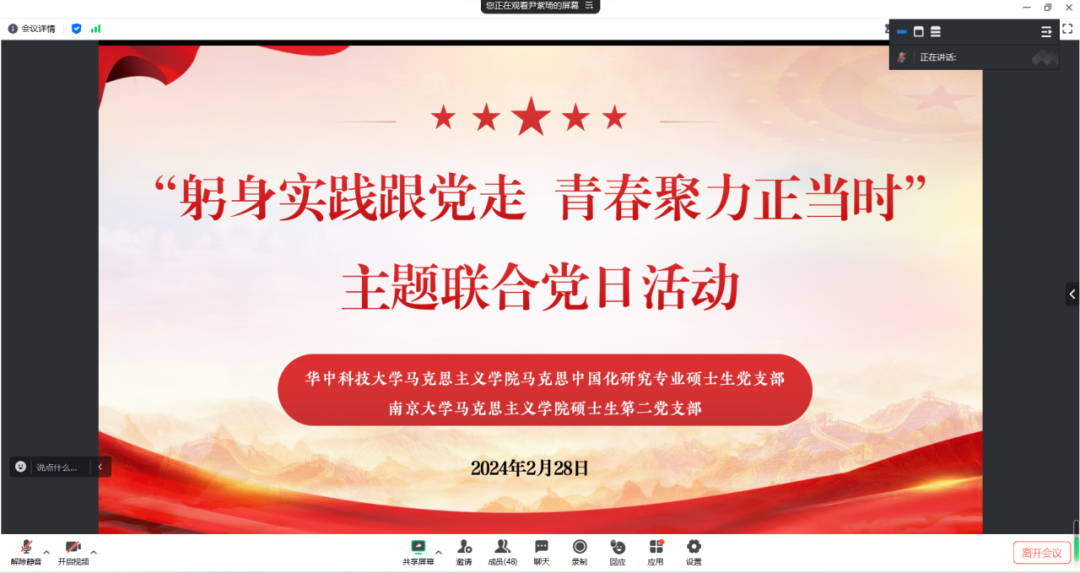(通讯员:赵姗琳)为全面学习贯彻习近平新时代中国特色社会主义思想,持续推进主题教育走深走实,搭建支部建设交流平台,共享社会实践孵化经验,2024年2月28日晚,华中科技大学马克思主义学院马中化研究专业硕士生党支部与南京大学马克思主义学院硕士生第二党支部以“躬身实践跟党走,青春聚力正当时”为主题,举行线上联合主题党日活动。活动由南京大学马院硕士生第二党支部书记尹紫琦主持,两支部全体党员参加。