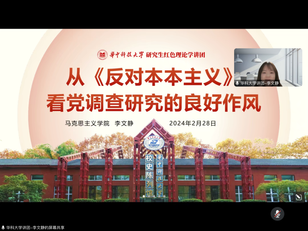 华中科技大学研究生红色理论学讲团讲师李文静受邀参会,以“从《反对本本主义》看党调查研究的良好作风”为主题展开理论宣讲。她生动地讲解了《反对本本主义》的写作背景、蕴含的调查研究思想以及当代启示,并结合华中科技大学学子的志愿服务经历,引导大家深刻领会《反对本本主义》的精神内涵,并号召青年党员们从书斋走向田野,做求实、务实、踏实的实干家。