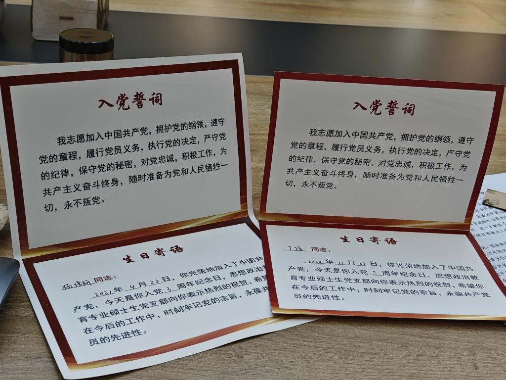 理论学习结束,进入“集体政治生日”环节。支部为党员送上政治生日纪念卡,并由杨跃带领与会同志重温入党誓词,希望大家牢记党员身份,提高政治站位,发挥模范作用。同时,支部为即将踏入新征程的毕业生党员送上定制礼物,并寄语各位毕业生党员以梦为马、不负韶华,继续在人生的广阔天地中书写属于自己的华章。
