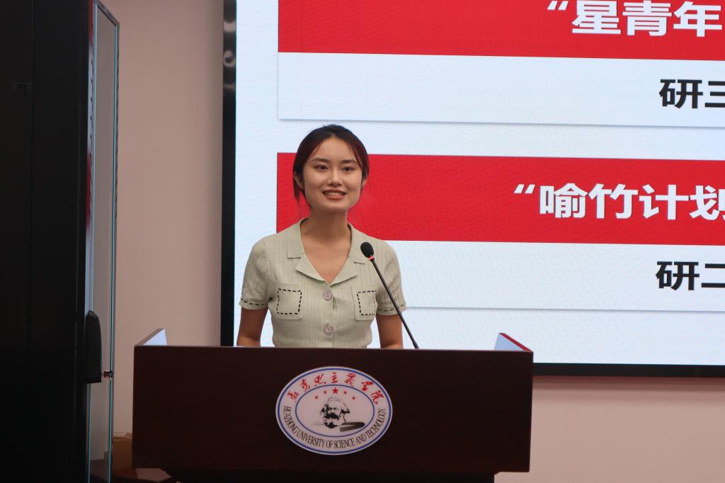 2021级硕士研究生毛明凤从江苏常州武进区的个人实习经历出发,对学校“星青年”工程作详细介绍。她从日常工作、食宿安排、基本流程等方面进行了分享,并现场展示了实习期间的相关照片及纪念品。她表示,“星青年”政务实习是自己人生中一段极其珍贵的经历,不仅提升了自身工作本领,还结识了众多志同道合的朋友。
