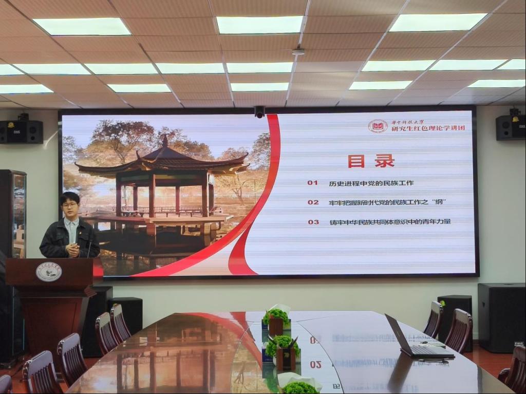 活动伊始,研究生红色理论学讲团讲师许英健为大家作《石榴花开,籽籽同心——铸牢中华民族共同体意识》的主题微党课分享。通过他声情并茂的讲解,同学们对党的民族工作以及铸牢中华民族共同体意识的重要性有了更加深入的了解。许英健指出,中国共产党的民族工作经历了许多曲折和艰辛才在各民族之间维系起牢不可断的纽带,作为新时代的新青年,我们要始终牢牢把握新时代党的民族工作之“纲”,坚持“四个必然要求”,筑起抵制各种错误思潮的高墙,铸牢中华民族共同体意识中的青年力量。
