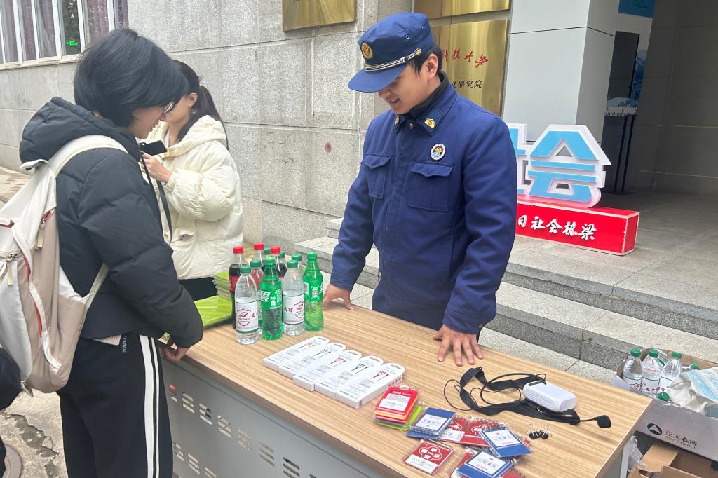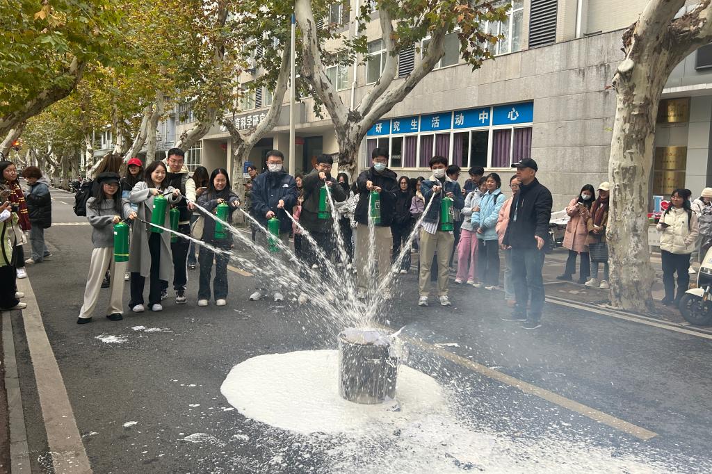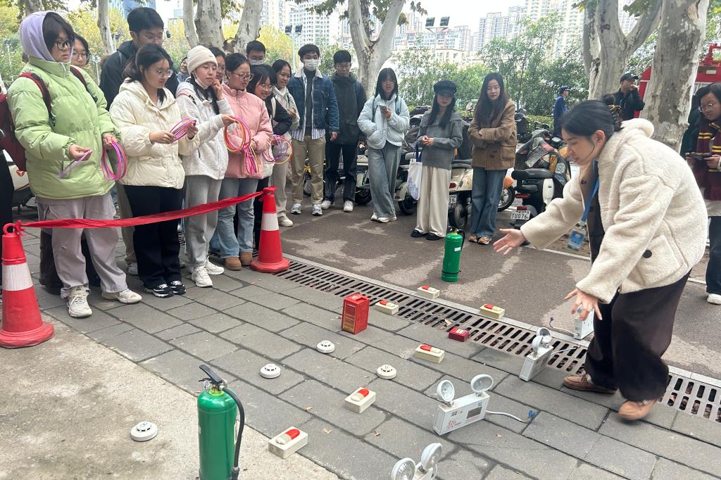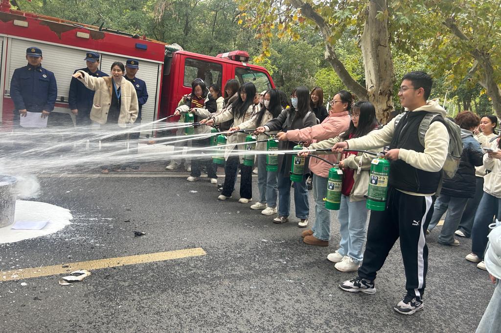 活动第二项,在工作人员的带领下,三院师生前往东七楼前的空地开展消防技能实操演习。在工作人员的带领和指导下,三院师生手持干粉灭火器,按照“一抽、二压、三对准、四扫射”的使用口诀,将灭火器对准火苗根部扑灭火堆。接着,在消防队员指导下,三院师生顺利进行了灭火实操。随后,通过消防器具套圈游戏,大家进一步掌握了消防器具使用的基础知识。
