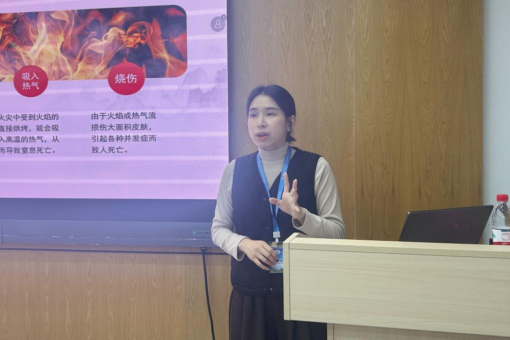 活动第一项,由学校保卫处陈嘉璇老师进行消防安全讲座。讲座中,她指出了校园潜在的消防安全隐患,强调了学习消防知识的重要性,并详细讲解了灭火器的使用方法以及注意事项,特别提醒大家在使用灭火器前要注意检查其有效期和压力情况。通过几例消防事故案例,大家意识到了掌握消防知识与逃生技巧的必要性。