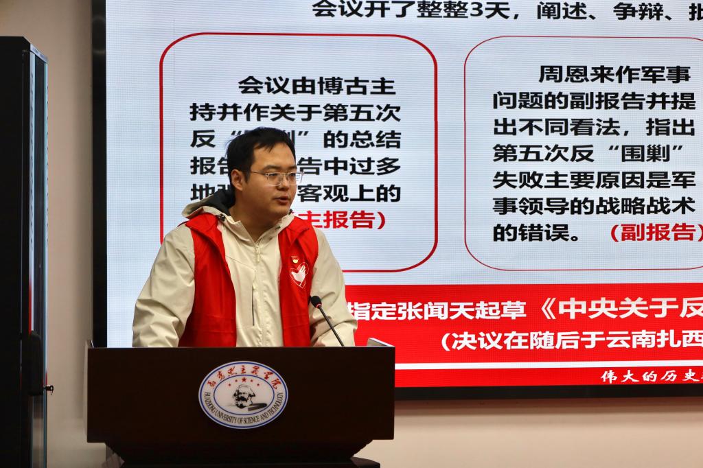 会议第二项议程是特邀研究生青马班遵义会议精神志愿宣讲团进行授课。宣讲团成员杨一博以生动的案例、详实的资料和深刻的理解,向与会师生详细阐述了遵义会议的历史背景、历史过程、主要内容、历史意义和精神内涵。通过授课,大家更加深入地了解了党的光辉历程和革命精神,也进一步坚定了理想信念,增强了责任感和使命感。