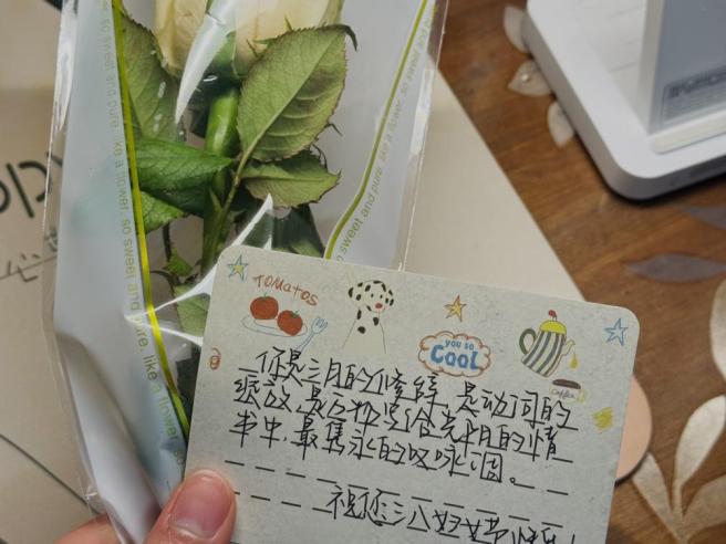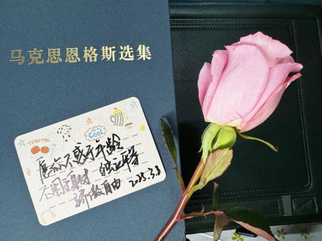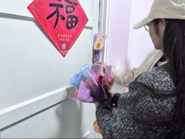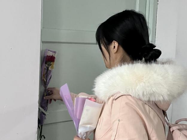 为了让学院每一位女同学都感受到节日的关怀与温暖,活动还特别策划了“宿舍送花”环节。3月7日晚,一场“惊喜行动”悄然展开。志愿者们悄悄在女生宿舍门口粘贴了小型花束和春日主题祝福卡片。花束以康乃馨和香槟玫瑰为主,搭配精心设计的祝福卡片,营造着温馨浪漫的节日氛围。这份“不期而遇”的浪漫让许多同学直呼:“这是最特别的节日礼物!”