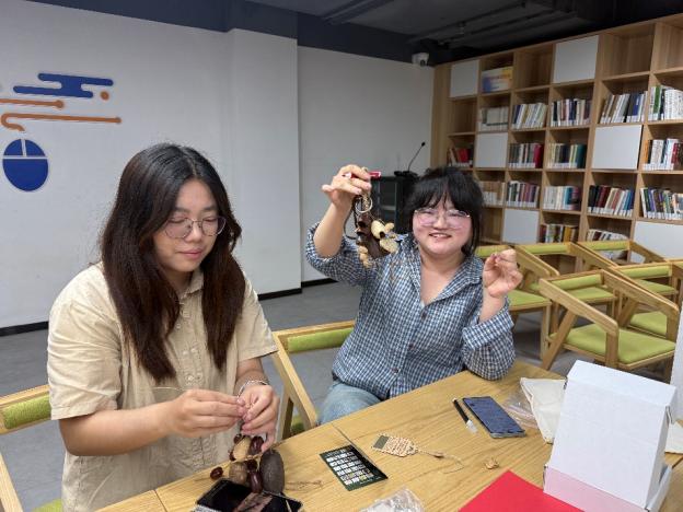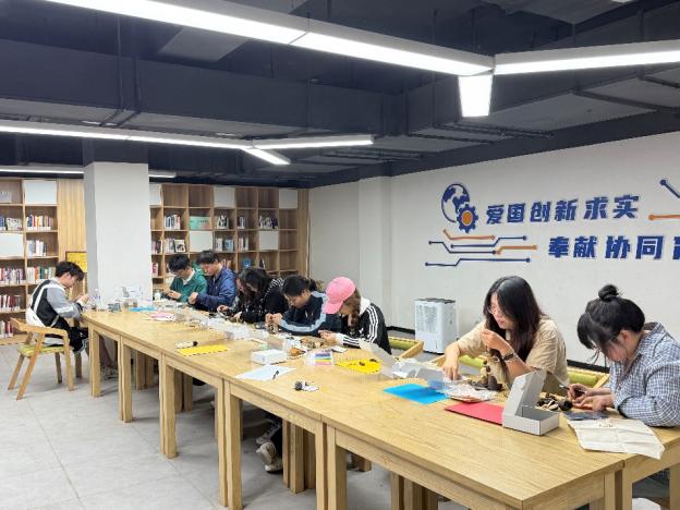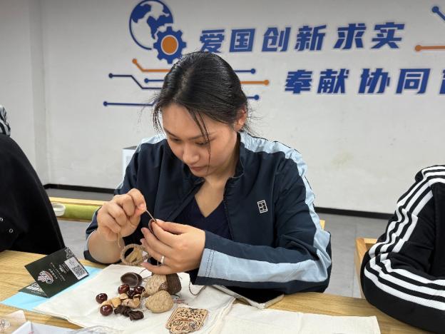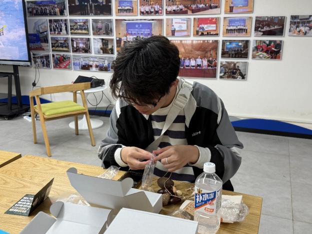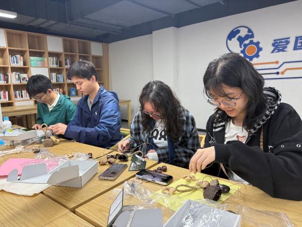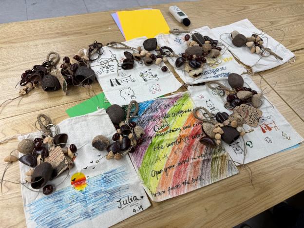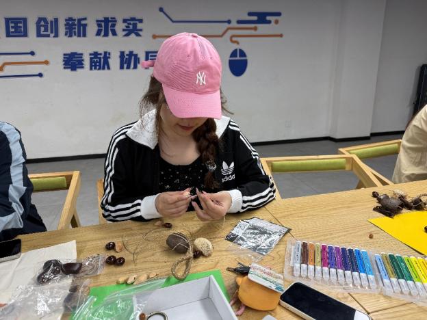 作为本次活动的核心环节,同学们领取材料包,在轻音乐中开启创意手作。果壳、铃铛、麻绳与木环在碰撞,颜料在收纳袋上绘制的斑斓图案,每一串风铃都承载了独特的意义。同学们沉浸在制作过程中,精心打磨着每一个细节,让亲手打造的风铃成为生活中的美好点缀。