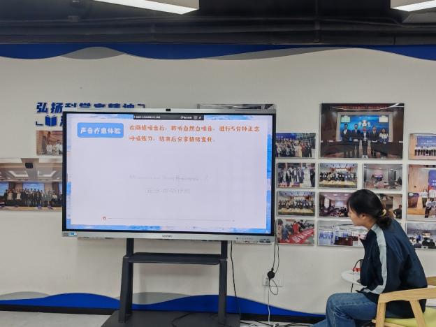 在隔绝外界嘈杂的静谧空间中,同学们闭目聆听自然白噪音与冥想音乐,跟随引导进行正念呼吸练习。短短5分钟的声音疗愈,让大家内心的焦虑与疲惫在无形中悄然消散,为同学们高压的学业生活提供了全新的“降噪”思路。