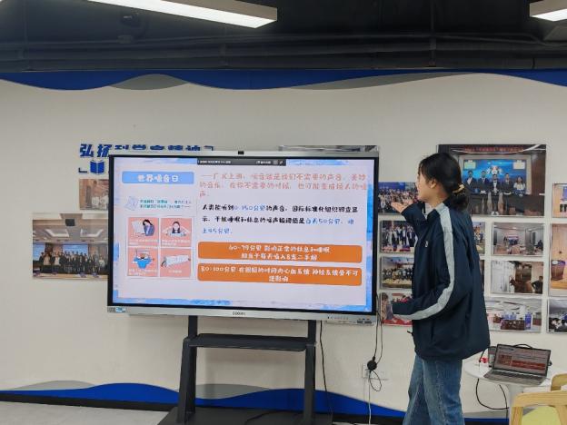 活动伊始,主持人刘梓童以生动的案例和科学数据,向同学们揭示了噪音对情绪、专注力与健康的“隐形影响”:60-79分贝就会影响正常的休息和睡眠、80-100分贝则会在短时间内对心血系统神经系统造成不可逆影响,而噪音分贝挑战显示敲击键盘声达到了82-89分贝、拉动桌椅声可达103分贝,让参与者们感到烦躁与不适。通过这一环节,大家不仅直观感受到不同噪音环境下的心理波动,更学会了用科学视角重新审视生活中的“声音边界”。