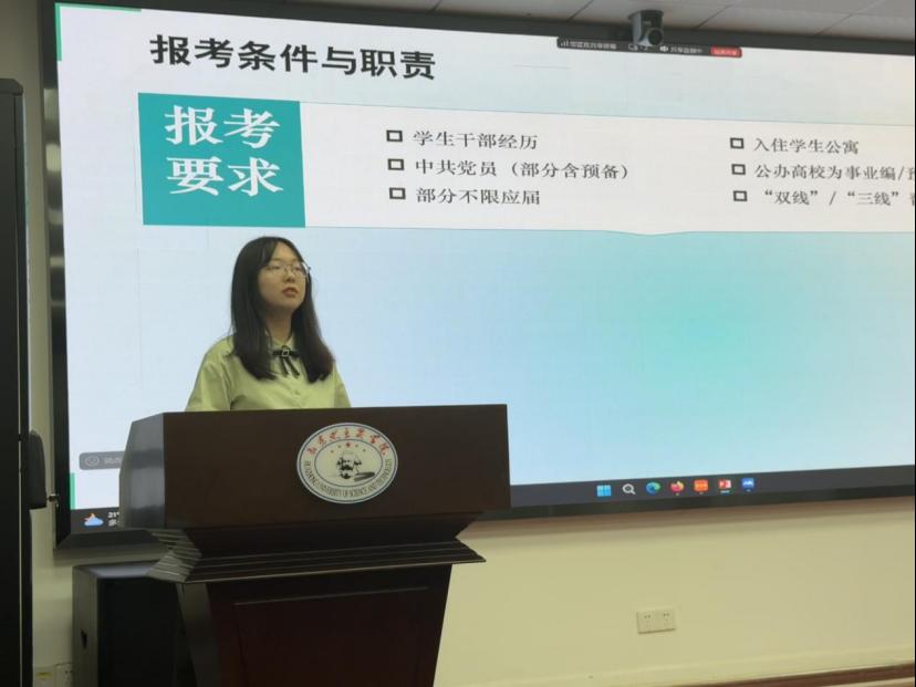 最后,2022级党的建设方向硕士生李柯依线上分享了自己在选调备考中岗位选择和备考计划制定方面的经验。她结合自身经历,分析了不同城市岗位的特点和优势,以及如何根据自己的职业规划和兴趣爱好进行选择,并详细介绍了备考过程中如何制定合理的复习计划,包括学习时间的分配、各科目的复习重点和难点等。她还分享了一些实用的学习方法和备考技巧,鼓励同学们要坚定目标,持之以恒地努力。