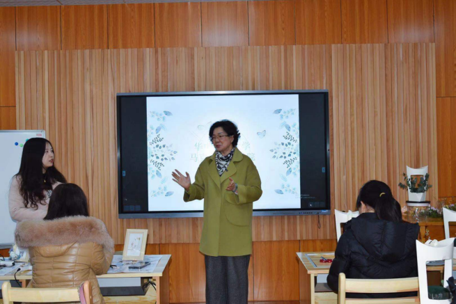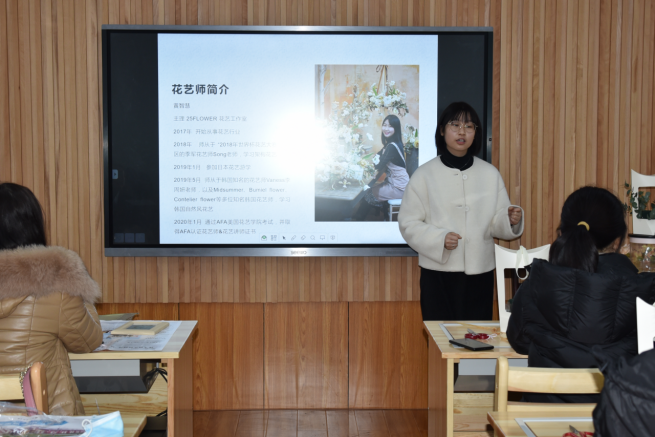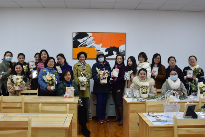 随后,花艺老师从花艺作品介绍、作品整体形态、花材的分类认识、实用的花艺小技巧四个方面为全体女教师介绍了永生花的制作以及鲜花的搭配技巧。