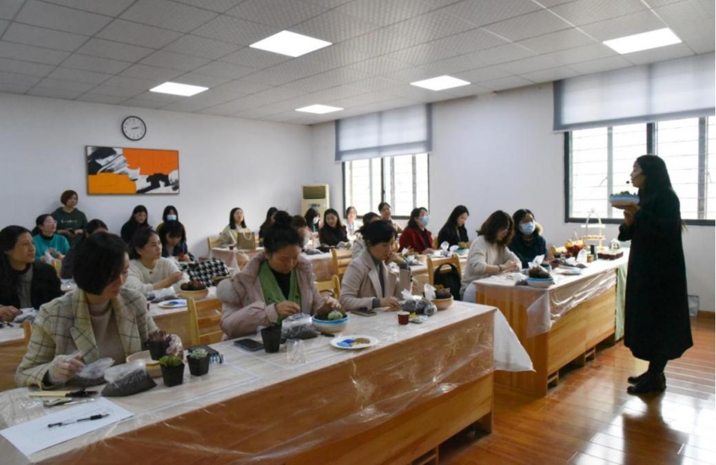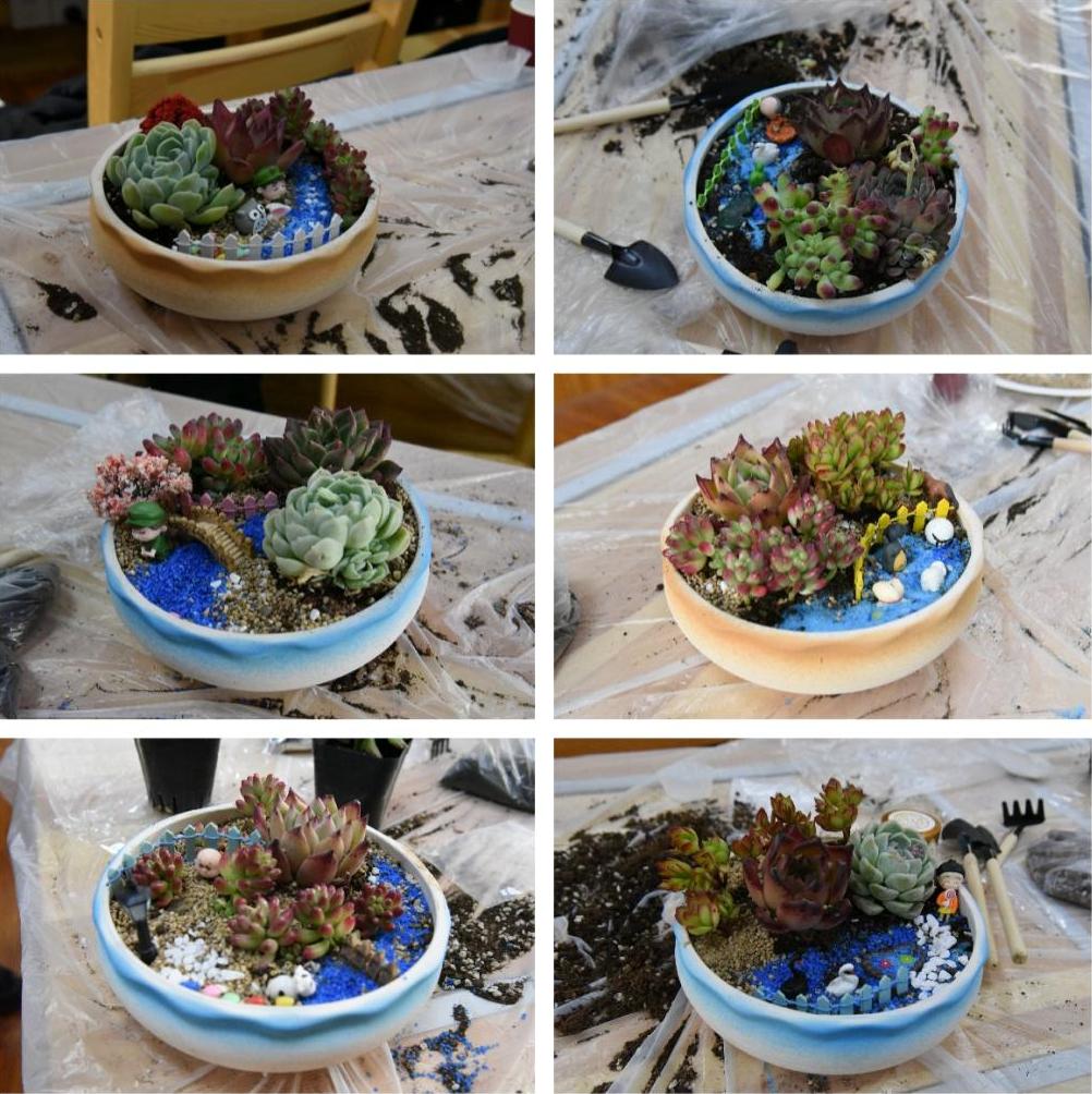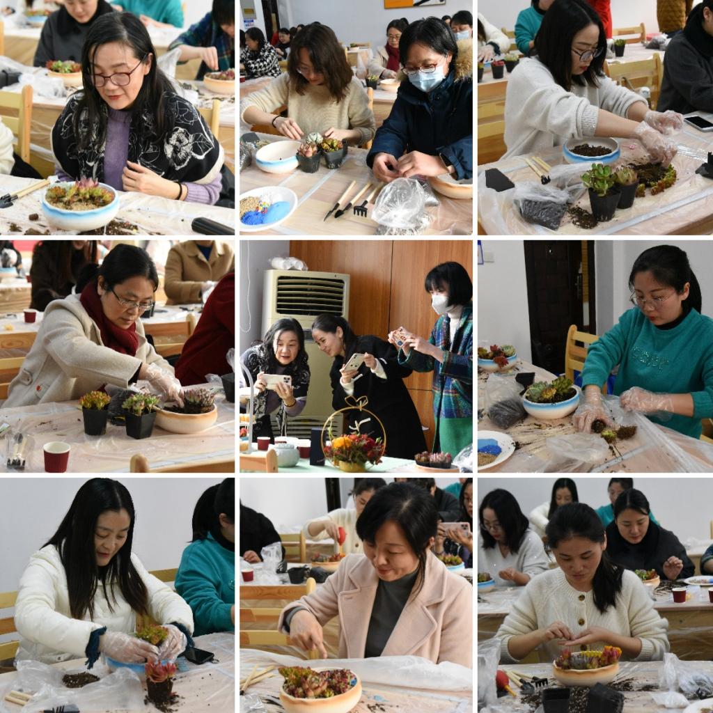 活动在欢声笑语中拉开序幕,在专业老师的指导下,老师们认真学习如何选盆、如何布局以及土的厚度、如何养护等。听着专业老师的娓娓道来,老师们跃跃欲试,纷纷拿起多肉饶有趣味地种植着。大家在动手制作的过程中展示出丰富的创造力,打造出各具特色的“纯手工盆景”,感受种植栽培的乐趣。