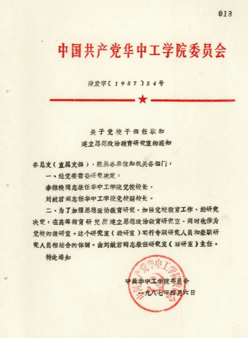 到1987年4月,当时学校党委下了个文件,就是在学校党校的下面成立一个思想政治教育研究室,跟高教所的研究室结合,我做主任。就这段时间对学校来说是一个探索时期,准备时期。