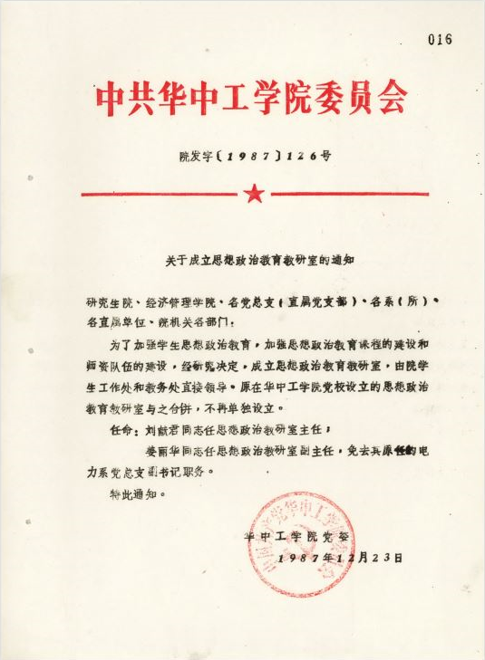到1987年12月,学校党委就正式发文,成立思想政治教育教研室,我做主任,我兼主任,姜丽华做副主任。当时党委书记李德焕同志非常重视,配备了专职老师,加上我们主任副主任,还有这个周进,张晓明,杨一平,一共5个。然后,建了资料室,配备了一个资料员,这个整个结构啊……(学校党委)很重视,就把它建立起来了,开始了。