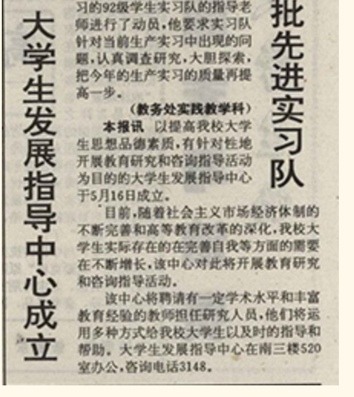 第二件让我觉得比较有价值的事,就在我做教研室主任的这段时间吧,时间其实不长,我1997年元月份我就离开了这个岗位,到了物理系去了,所以就是这短短的几年里面还做了一件我个人觉得有价值的事,那就是我,还有杨老师,还有陈海春这些老师,我们这些专业的老师应当来说,是非常热爱这个工作,而且我们三个人的共同点是我们都来自于实践,我们都有着过去从事学生教育管理工作的实践的背景的,因此我们经常是边讨论教学问题,也边研究学生的现实问题,那么,我们当时是没有人对我们有任何要求,就是要求我们啊,你必须坐班呐,你必须怎么样,但是我们很自觉的,我们基本上就是嗯大家都是上班的时候就去了,去了以后大家也不是闲聊,而是围绕着怎么样能够把我们的学生的问题梳理清楚,然后怎么样能够帮到学生。所以正是在这样的碰撞下,特别是我们都在上这门课程一碰的时候,大家都觉得课后那么多的学生找我们咨询各种各样的问题,包括想死的,包括要跳楼的,包括因为这个学习有困难我过不去了这个坎的,因为谈恋爱谈崩了,我要怎么样的,就是各种各样的想都想不到的,我们的老师们呢可以说是付出了极大的努力。看上去我们在教学的学时数上,就那么几十个学时,但是我们这一批老师,特别是我们专职的老师,我们是公开我们的联系方式,公开我们的办公地点,因为我们的着力点就是为了促进学生的发展,而且是要健康的发展。因此(跟)学生明确说了,学生有什么任何的问题都可以来找我们,寻求帮助,我们一定尽我们所能来帮助你们。因此呢课后就是我们这批老师原则上24小时那个时候我们就是24小时准备应学生之约的,那个时候学生有求我们就必应的,没有说什么吃饭的时间到了,我得要走,对不起你去吃饭我走了,对不起下班了我走了,没有的。所以根据这种情况我们就反复研究,这不是个事儿,几乎顾不了家了,那个时候我们就合计着,提出了要成立大学生发展指导中心,我们三个人在这里议议议,光说取这个名儿就议过多次,最后大家一致同意用大学生发展指导中心,实际上就是现在的心理健康教育咨询中心,但是我觉得当时的这个学科的专业的发展在国内不是很成熟吧,在国外是很成熟的,在国内它毕竟是个新的,然后很多人不太能够愿意接受,因为一听到心理心理就有病,所以说对大学生来说他更是不愿意接受。但是我们觉得我们切入点是帮助你发展,帮助你矫正认识和行为的偏差,那么这个就挂牌了。具体的时间我想应该是在95年底或者是96年,95年应该是在95年,然后就正式挂牌了。