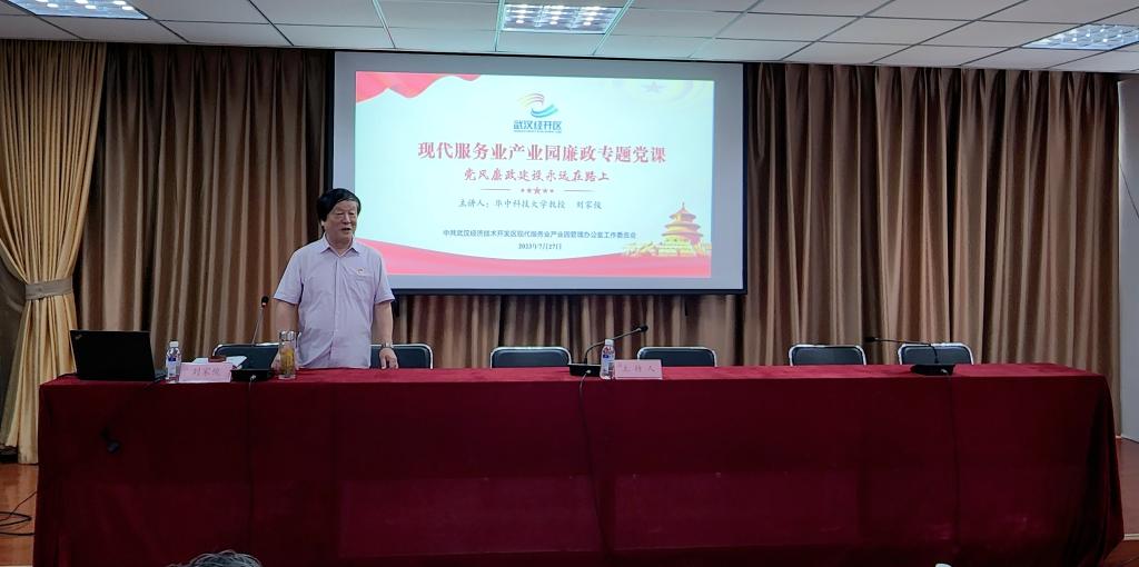 (通讯员:吕洪良)7月27日,华中科技大学与武汉经开区现代服务业产业园共建的“理论热点面对面实践基地”召开二三季度系列活动,我院刘家俊教授应邀出席报告会并作题为《党风廉政建设永远在路上——再读三篇马克思主义的经典》的讲座。现代服务业产业园及中国城乡、中文在线、湖北水总、中国电建贵阳院城建设计院等企业代表共计50余人参加活动。本次报告会由武汉经开区现代服务业产业园管理办公室副主任焦文超主持。